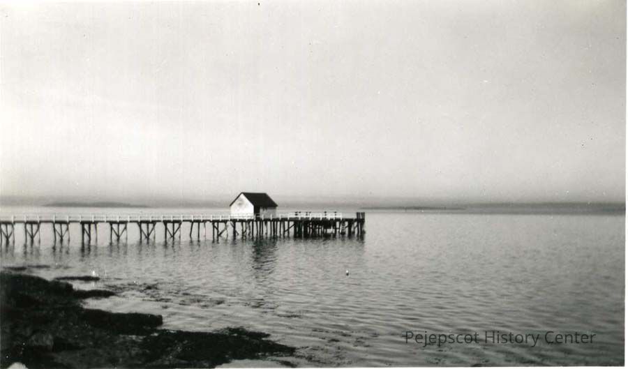 A black and white photo of the steamboat wharf off of Orr's Island, Harpswell, Maine taken in the spring-summer of 1946.