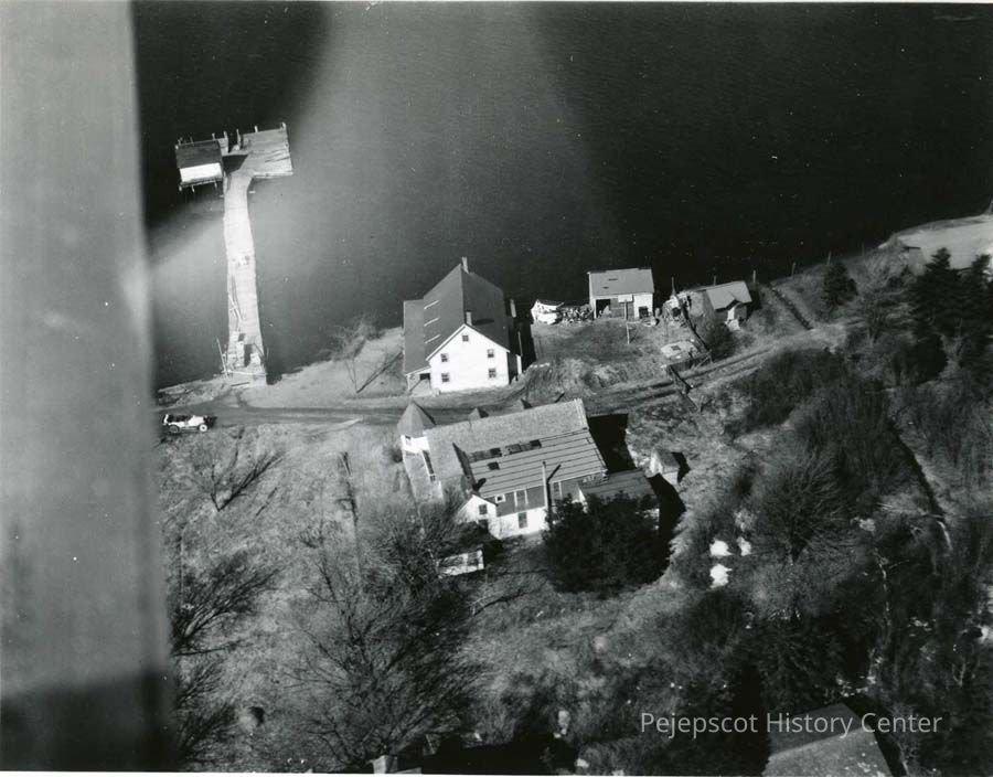An black and white aerial photo of the steamboat wharf on the western shore of Orr's Island, Harpswell, Maine ,Spring 1946.