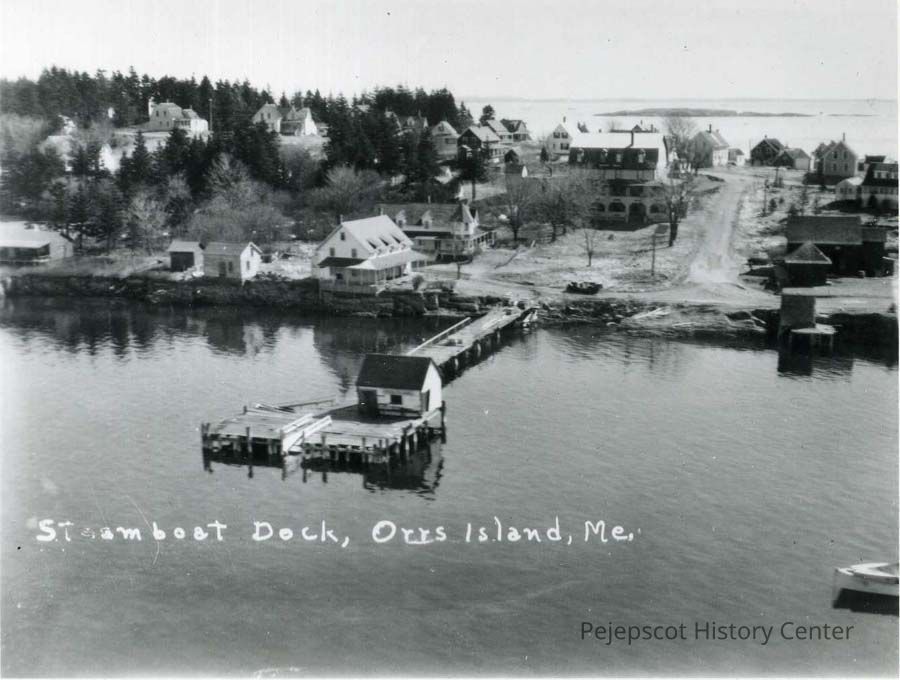 A black and white aerial photo of the Steamboat Wharf on the western shore of the southern end of Orr's Island, Harpswell, Maine, dated Spring 1946.