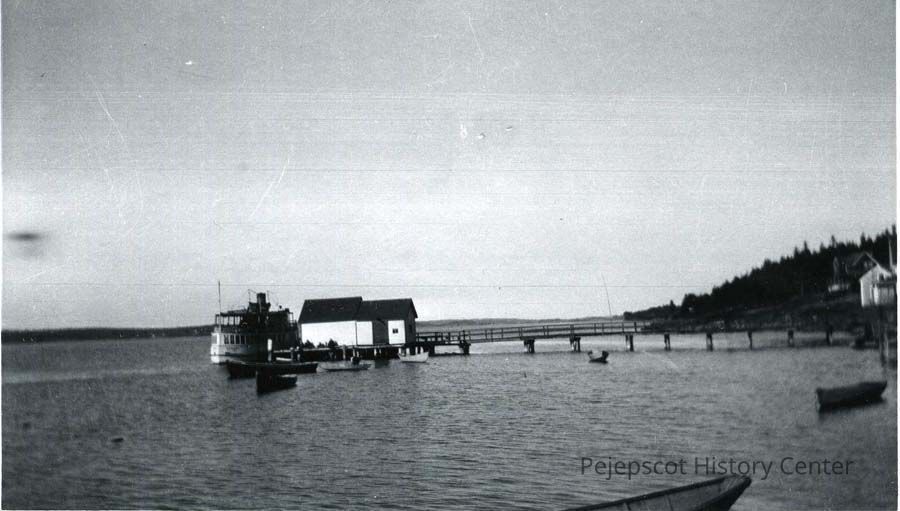 A black and white photo of a steamer docked at the Steamboat Wharf on Orr's Island, Harpswell, Maine dated Sunday, October 16, 1927.
