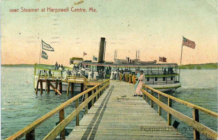 Color Postcard of steamboat and passengers at "Harpswell Centre".