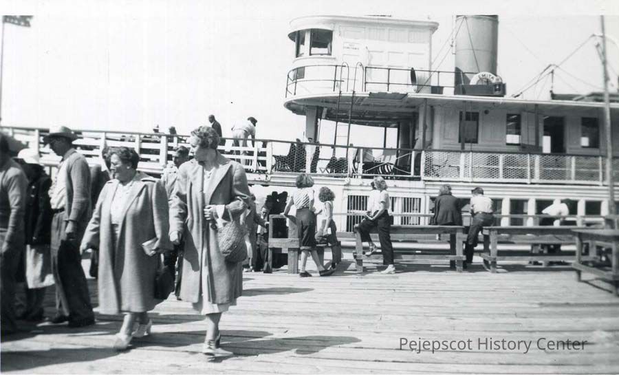 A black and white photo of the steamer Emita docked at the Orr's Island, Harpswell, Maine Steamboat wharf, September 5, 1948.