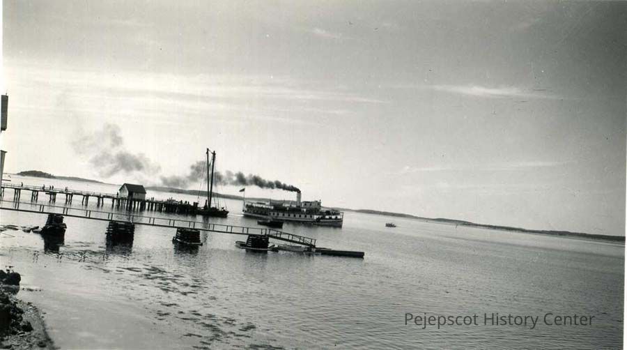 An undated black and white photo of a steamer leaving the Steamboat Wharf on Orr's Island, Harpswell, Maine.