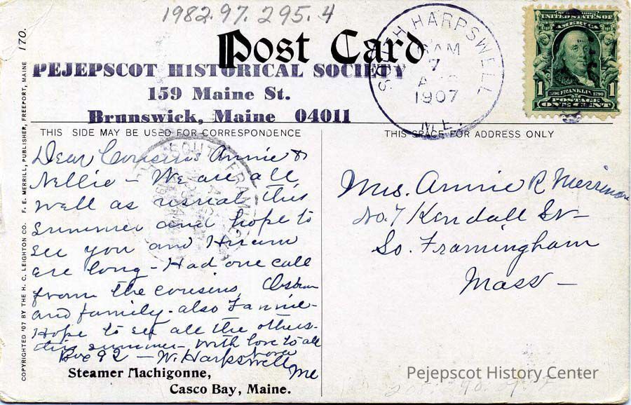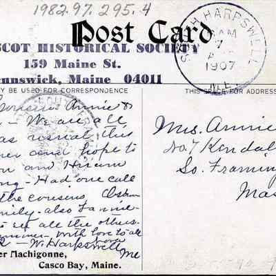 To: Mrs. Annie R. Merriman, 7 Kendall St., So. Framingham, Mass. Postmarked So. Harpswell, Maine, Aug. ?, 1907. "Dear Cousins Annie and Nellie - We are all well as usual this summer and hope to see you and Hiram ere long. Had one call from the cousins, Osborn and family. Also Fannie. Hope to see all the others this summer. With love to all. Nora (?)Lexicon