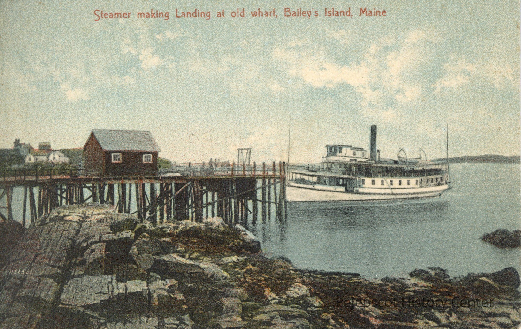 Color photo postcard of a steamer making Landing at old wharf, Bailey, Island, Maine.Collection