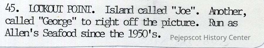 A color print copy of the Steamer Maquoit arriving at Lookout Point in Harpswell Center. The island is called "Joe." The buildings were run as Allen's Seafood since the 1950's. See back of photo for more info. UndatedCollection