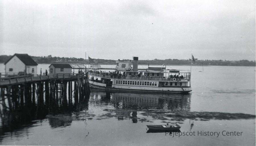 An undated black and white photo of the steamer Merryconeag at the steamboat wharf on Orr's Island, Harpswell, Maine