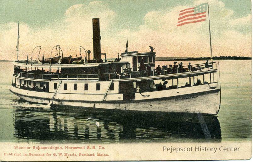 An undated color postcard of the steamer Sebascodegan of the Harpswell Steam Boat Company, Maine. It was published in Germany for G. W. Morris, Portland, Maine.Lexicon