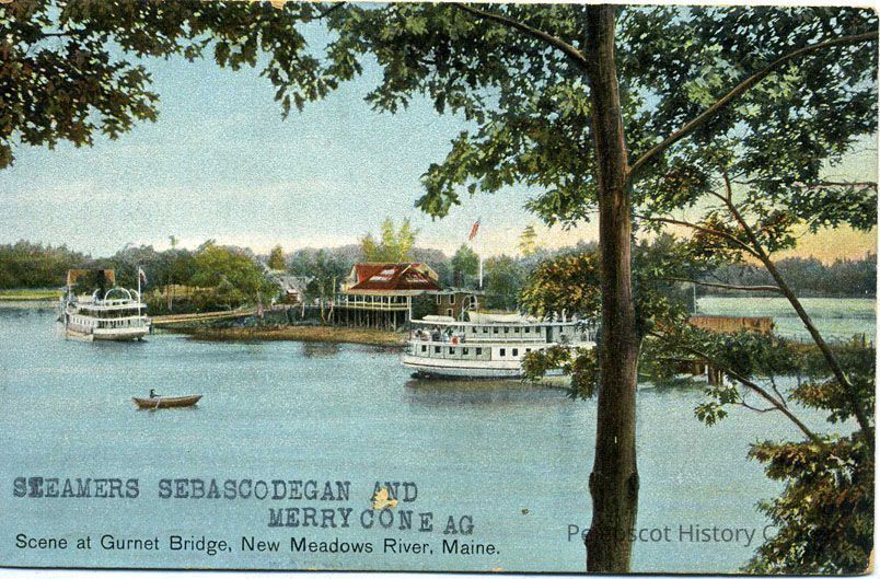 An undated color postcard of the "Sebascodegan" and "Merryconeag" steamers at the Gurnet Bridge, New Meadows River, Maine.Lexicon