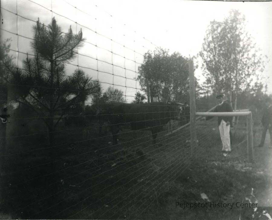 A B/W print from a negative, glass plate of a steer inside a wire enclosure at Merrymeeting Park.