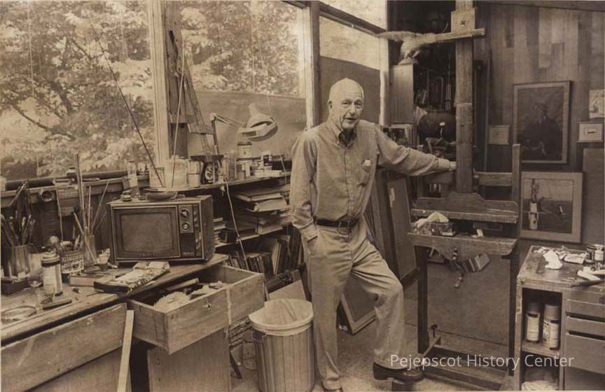 A black and white photograph of Stephen Morgan Etnier (1903-1984) at his studio in Harpswell, ME. He stands surrounded by finished and unfinished works, in his somewhat crowded studio.