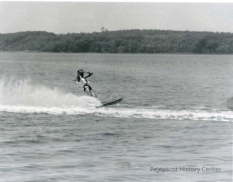 B/W photo of Steve Prefontaine water skiing on Maquoit Bay, Mere Point, Brunswick, ME. The U.S. Men's Olympic Track Team trained at Bowdoin College in the summer of 1972, before attending the Munich Olympics. The group visited the home of Doug and Nan Morrell on Mere Point, Brunswick, ME. Prefontaine, who died in an automobile accident in 1975, held records in seven different distance track events. 7/1972.Lexicon