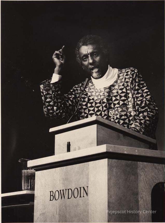 An undated black and white photograph of Black Panther leader and activist Stokley Carmichael speaking at Bowdoin College in Brunswick, Maine.