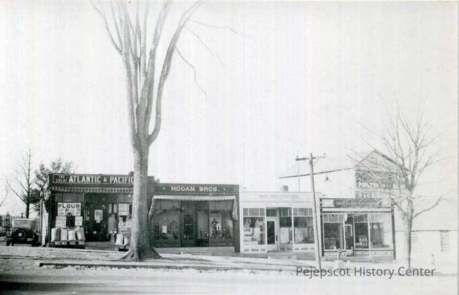 A black and white photograph of stores on the block south of the railroad tracks on Maine Street in Brunswick. They include the A & P and Hogan Brothers.