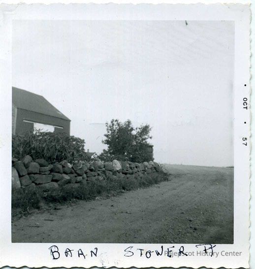 A black and white photograph of the Stover Barn, built in 1836 on Stover's Point, Harpswell, Maine.