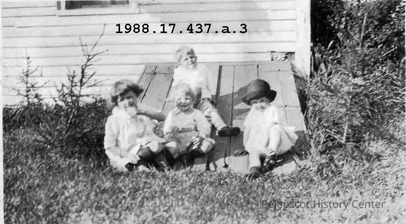 A black and white photograph of four Stover children, sitting outside a building on the grass and on a bulkhead door. The children and the setting are the same as 1988.17.437 a. 1, minus one child.