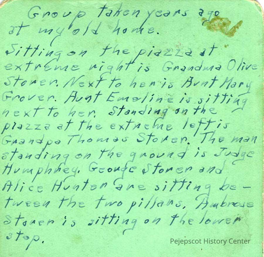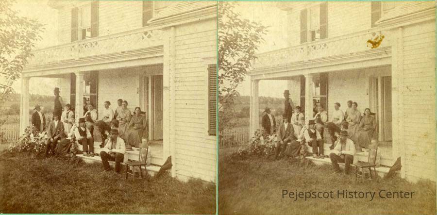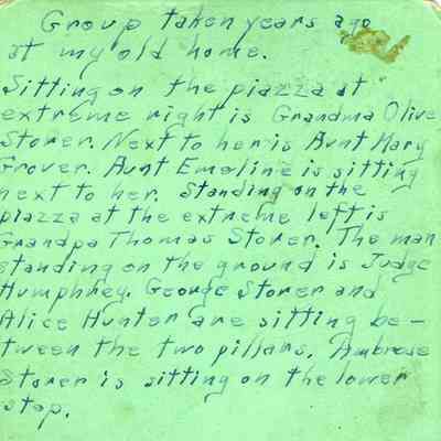 B/W stereo photo of the Stover family on a porch "piazza". They are identified as Olive Stover, Mary Stover, Aunt Emeline, Thomas Stover, Judge Humphrey, George Stover, Alice Hunter and Ambrose Stover. No date.