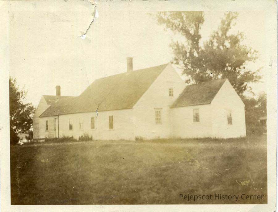 A black and white photograph of the rear view of Stover Farm in Harpswell Center, ME. Dated1920's.