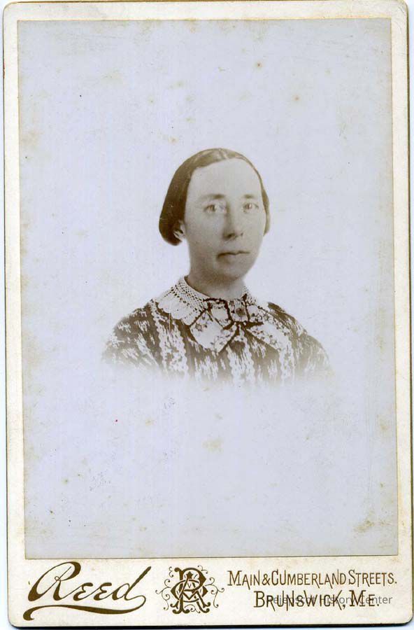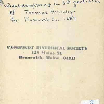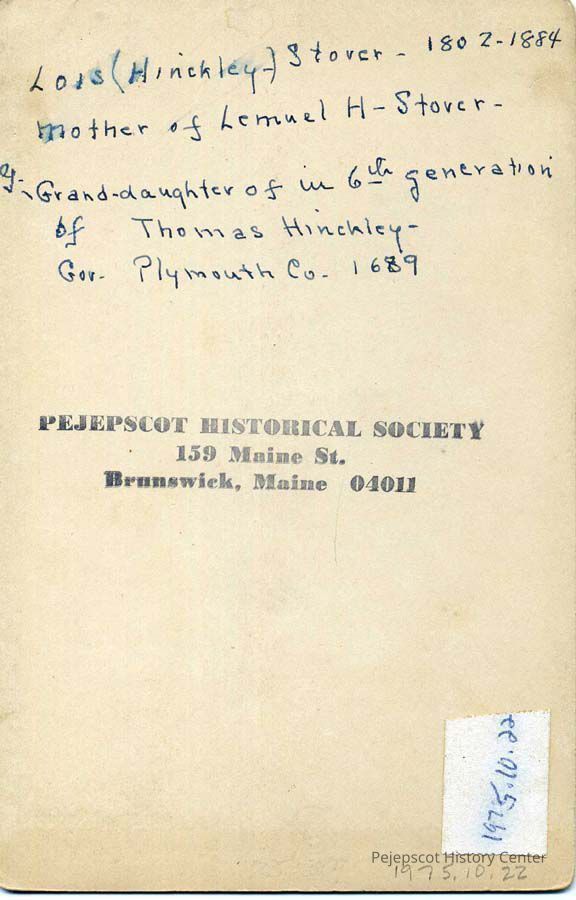 A black & white photograph of Lois Hinckley Stover (1802-1884). The back of the photo reads "Mother of Lemuel H. Stover. Granddaughter of in 16th generation of Thomas Hinckley, Gov. Plymouth Co. 1689." Undated.