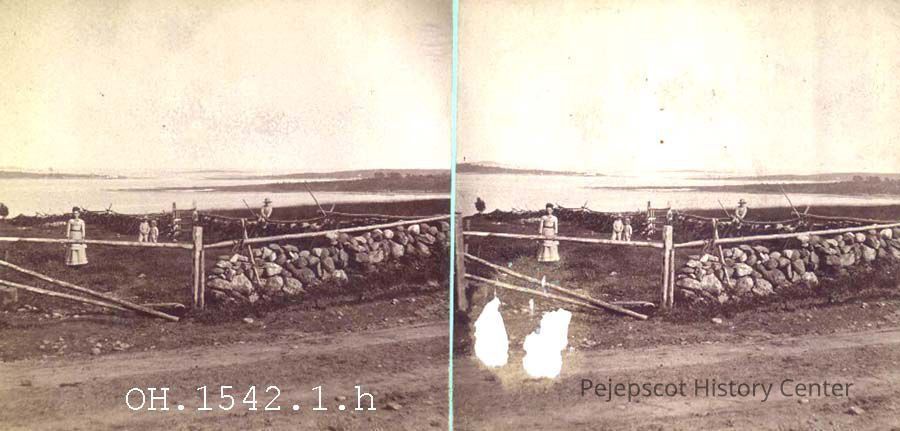 A B/W stereo view of Stover's Cove taken from Rte 123, Harpswell, ME. Orr's and Bailey's Island, Pond Island and Ragged Island are in the distance. Undated