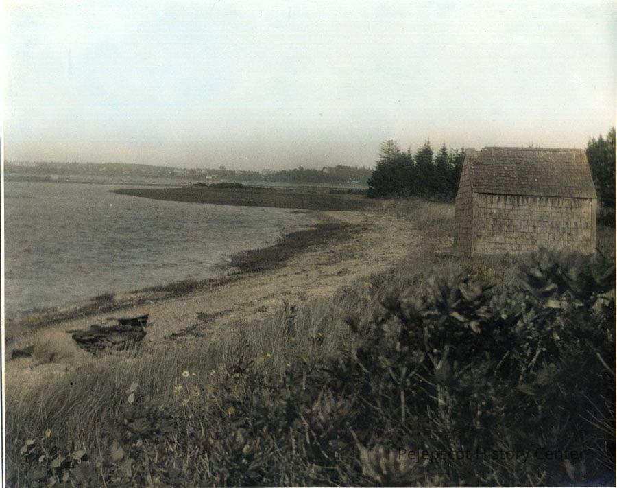 An undated black and white photograph of Stovers Cove in South Harpswell, Maine. There is a small structure on a dirt road adjacent to the water.