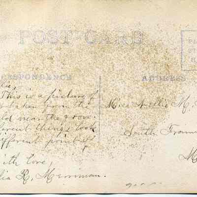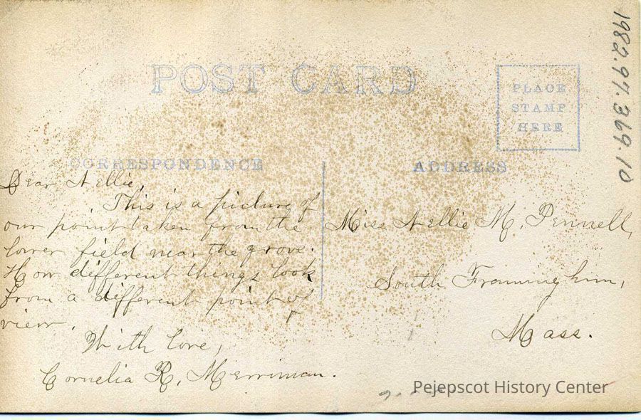 B/W postcard of Stover's Field, Harpswell. To Miss Nellie M. Pennell, South Harpswell, from Cornelia Merriman. No postmark or stamp.Collection