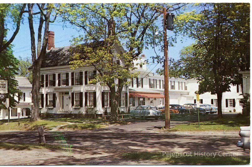 An undated color postcard of the Stowe House, 63 Federal Street, Brunswick. Harriet Beecher Stowe lived in the house from 1850-52. The picture appears to be taken when the Stowe House was a hotel. It is currently owned by Bowdoin College.