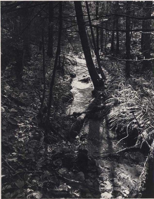 A B/W photograph of a stream in Maquoit Woods. Undated
