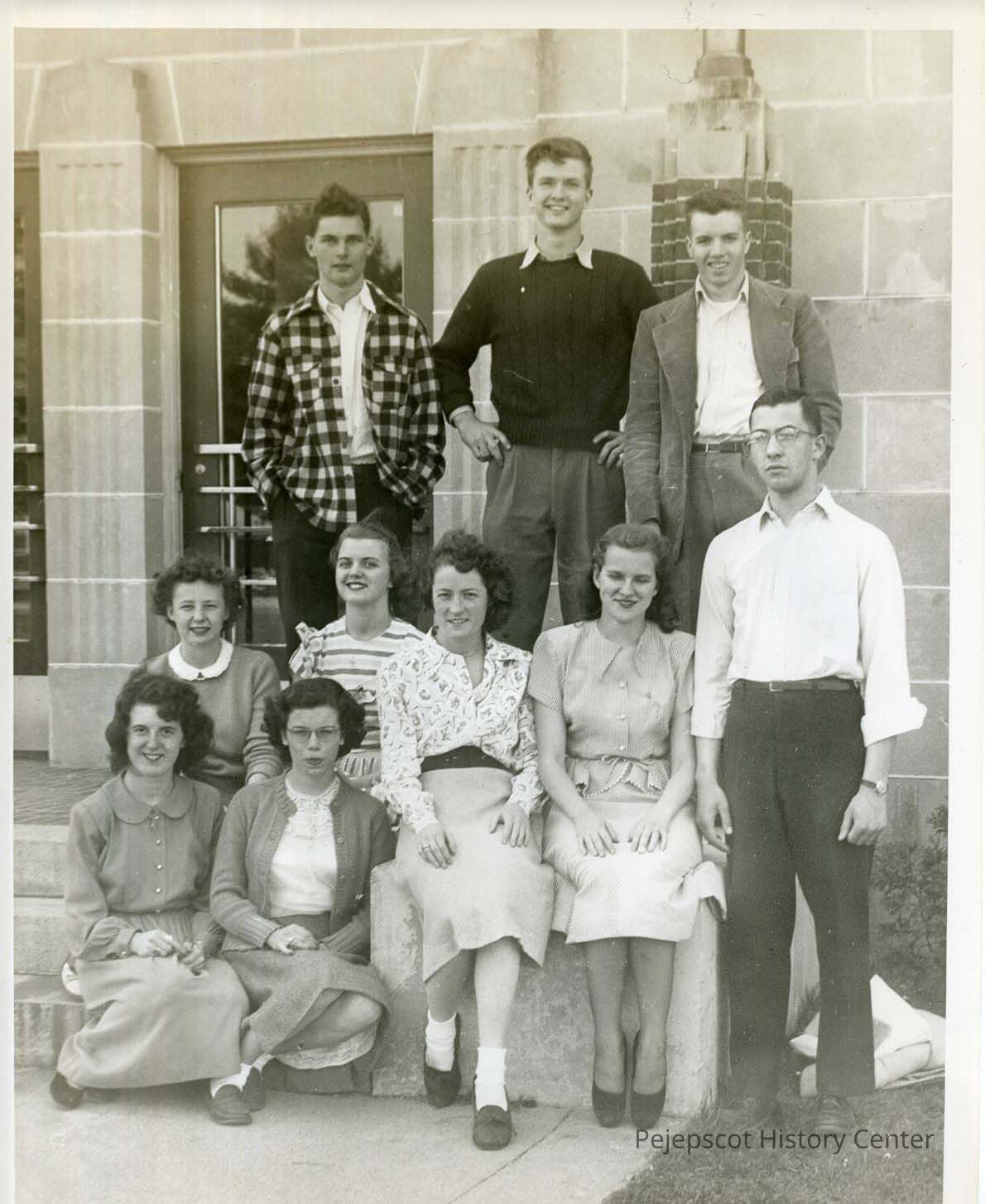 A picture of ten students standing in front of Brunswick High School. Seated on the lower step second from the left is Priscilla Davis. In the second row 2.) Betty Crooker, 4.) Dorothy Coombs, 5.) Bill Boucher. The boys in the back row are unidentified. Undated