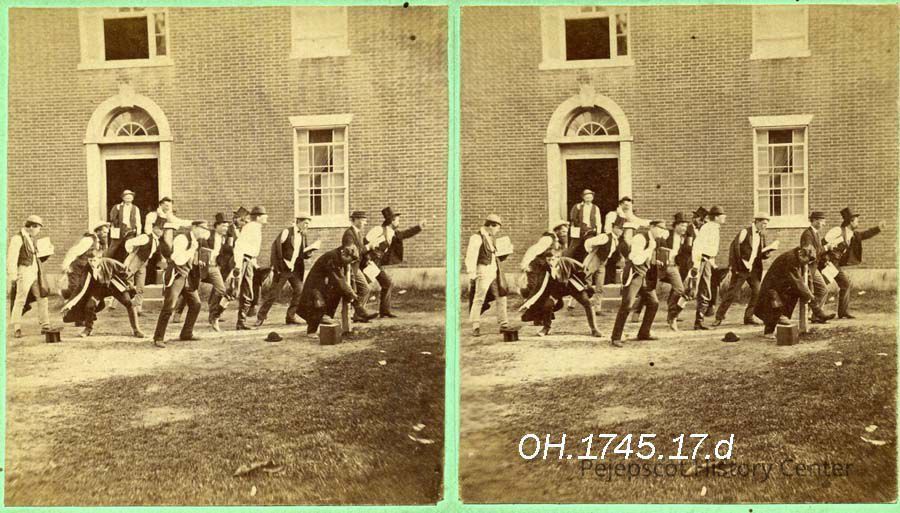 A stereo view photo of students going to evening prayer at Bowdoin College, Brunswick, ME. Not dated.