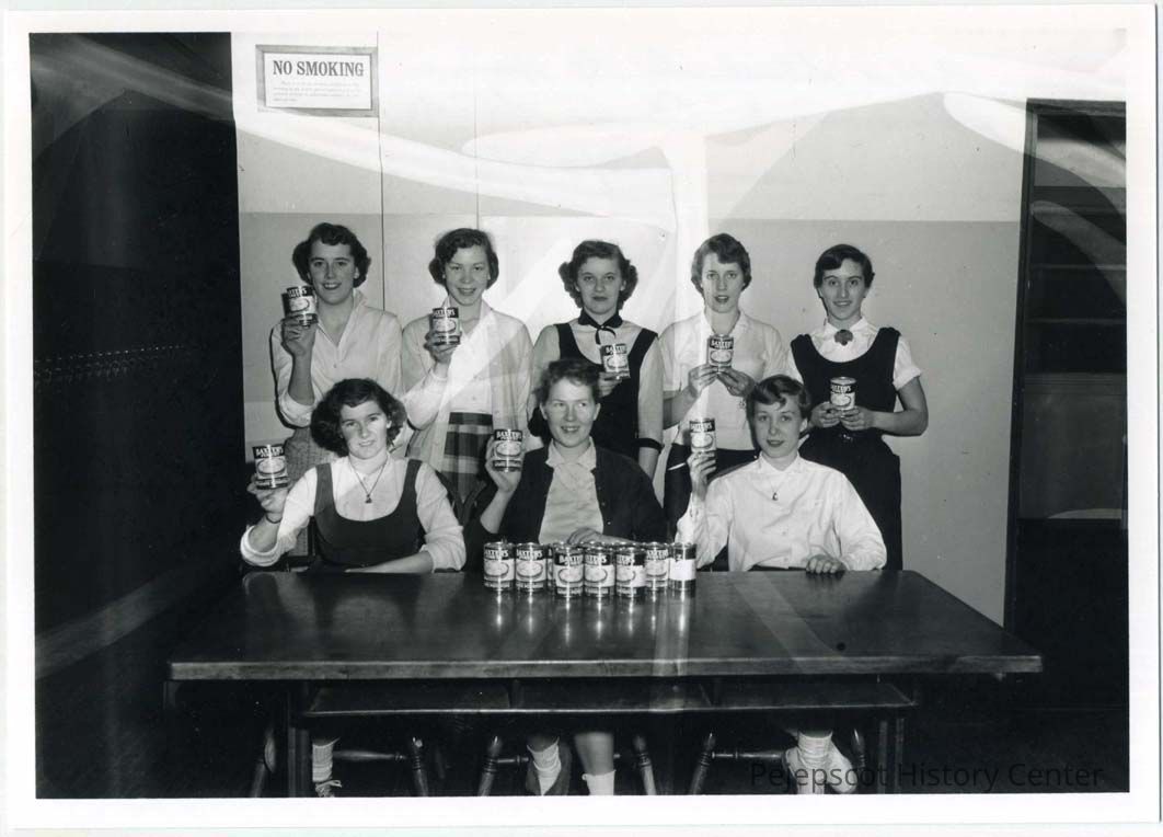 Eight BHS girls pose holding cans on 3/23/56. They plan to raise money for the Brunswick Area Student Aid Fund.
