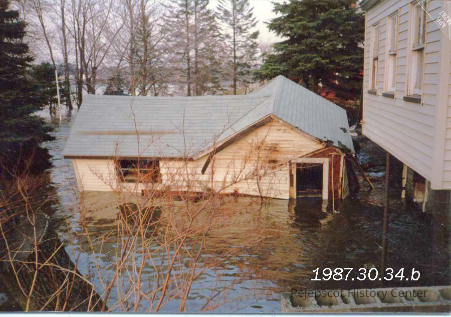 A color photograph of a submerged building. Probably on Water Street, Brunswick, Maine. Flood of April 1987.