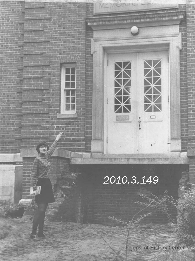 A B/W photograph of Sue Weissman pointing to missing stairs which will be replaced by a ramp as part of the renovations at the Curtis Memorial Library. Mention is also made of Pejepscot Historical Society taking over one room in the library to give public access to their documents. Photo published 9/19/1973. Undated