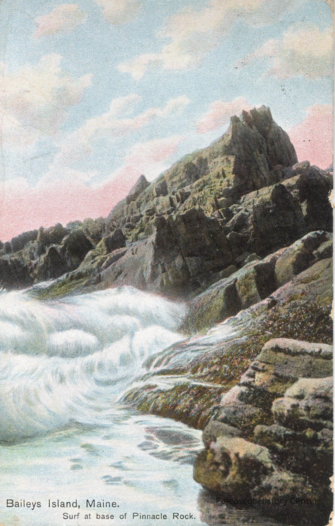 Color photo postcard of surf at base of Pinnacle Rock, Bailey Island, Maine.Collection