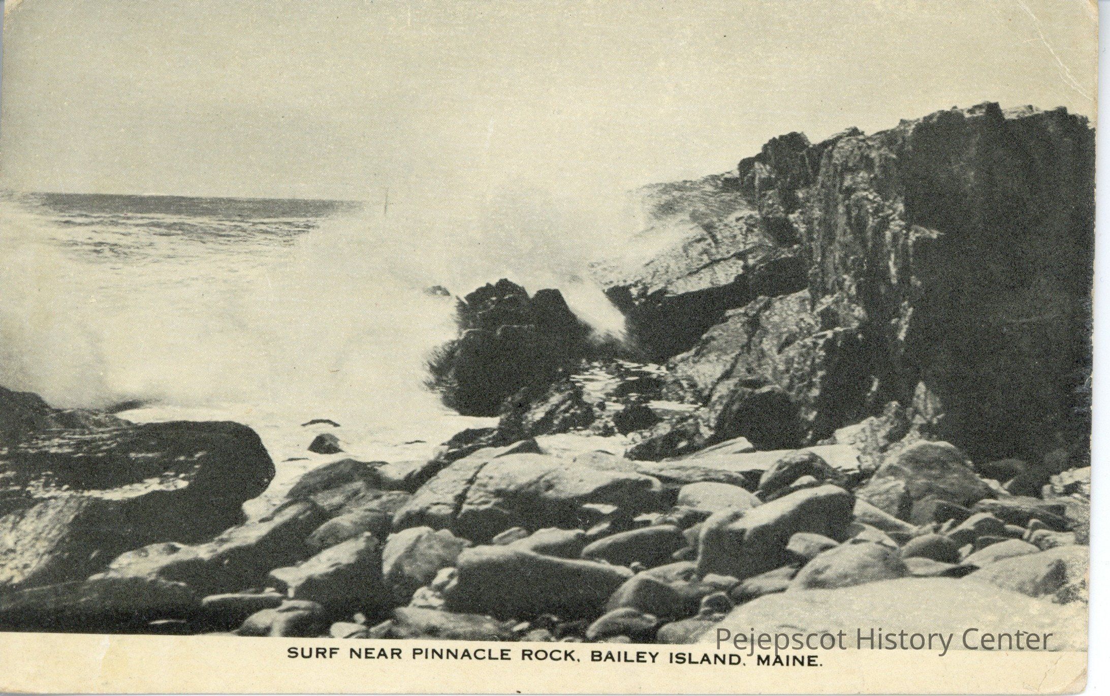 Black and white photo post card of surf near Pinnacle Rock, Bailey Island, Maine.Collection