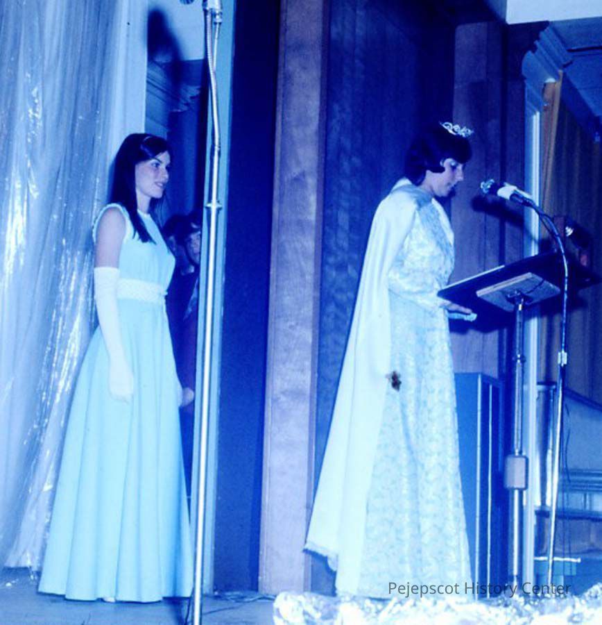 A 35 mm color slide of Susan DiEdwardo a contestant in the 1973 Miss Teen Queen Pageant. Doris Bernier, a former Teen Queen, is standing at the podium. The slide is marked, "2013." Undated