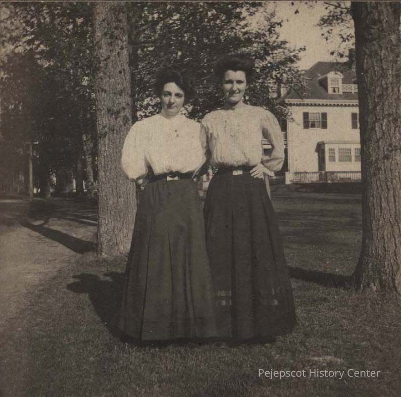 A B/W photo of two women. They are Miss Susie McGahey and Miss Florence Moody. Photo taken on College Street in Brunswick. Undated