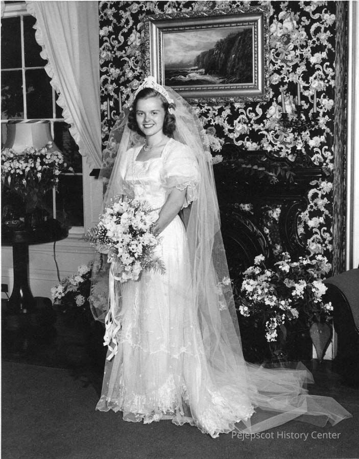 A B/W photograph view of Suzanne White Hayden, wearing her grandmother's wedding gown. Her grandmother was Elise Fellows White. 1897. Photograph was taken in the parlor of the Harriet Beecher Stowe House in Brunswick, ME. Dated 08/05/1950.