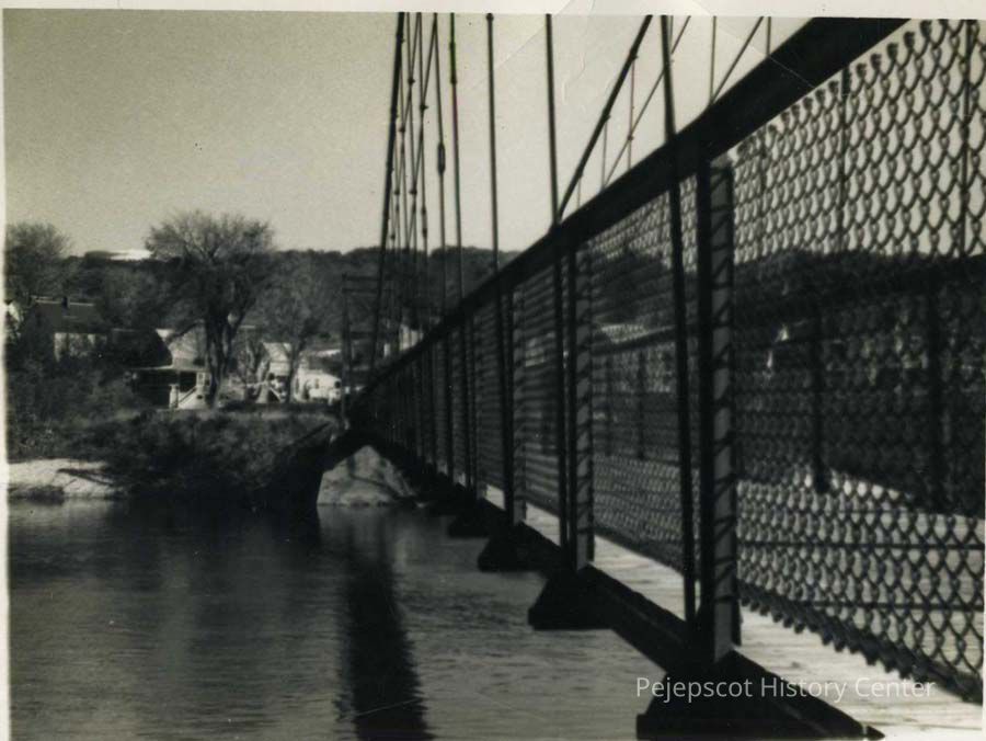 An undated black and white photograph of the Swinging Bridge between Topsham and Brunswick..