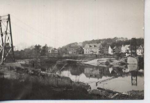 Photo of the Swinging Bridge over the Androscoggin River after damage in the 1936 flood. The Swinging Bridge provides pedestrian access between Brunswick and Topsham, Maine. This view is looking toward the Topsham side.