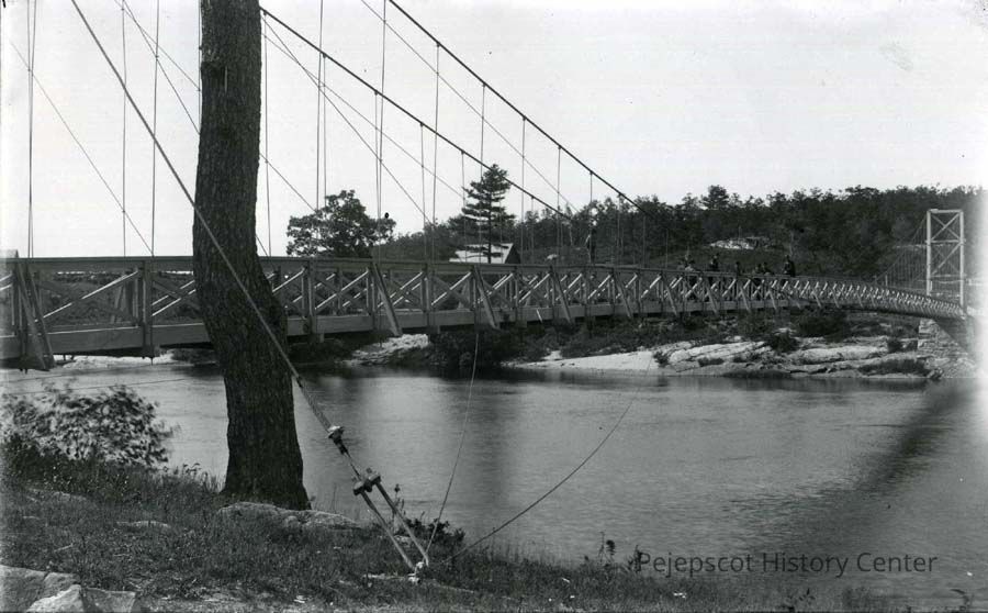 A B/W photograph view of the swinging footbridge at the foot of Cushing St over Androscoggin River in Brunswick, ME. Undated. Same as 1982.97.25.