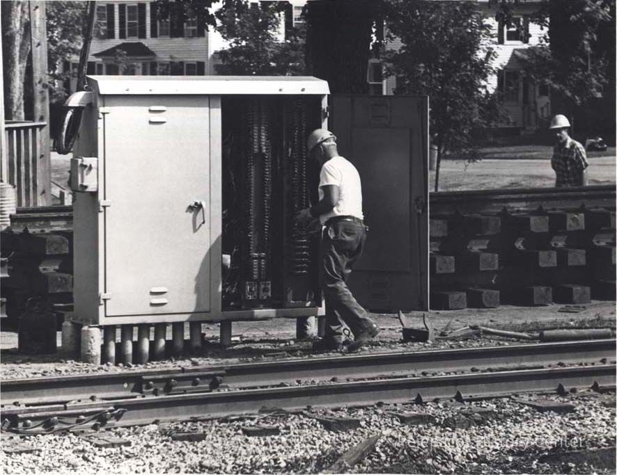 A B/W photograph of the electrical switch gear near the train wreck. The electrical gear controls the crossing signals on Park Row. Undated