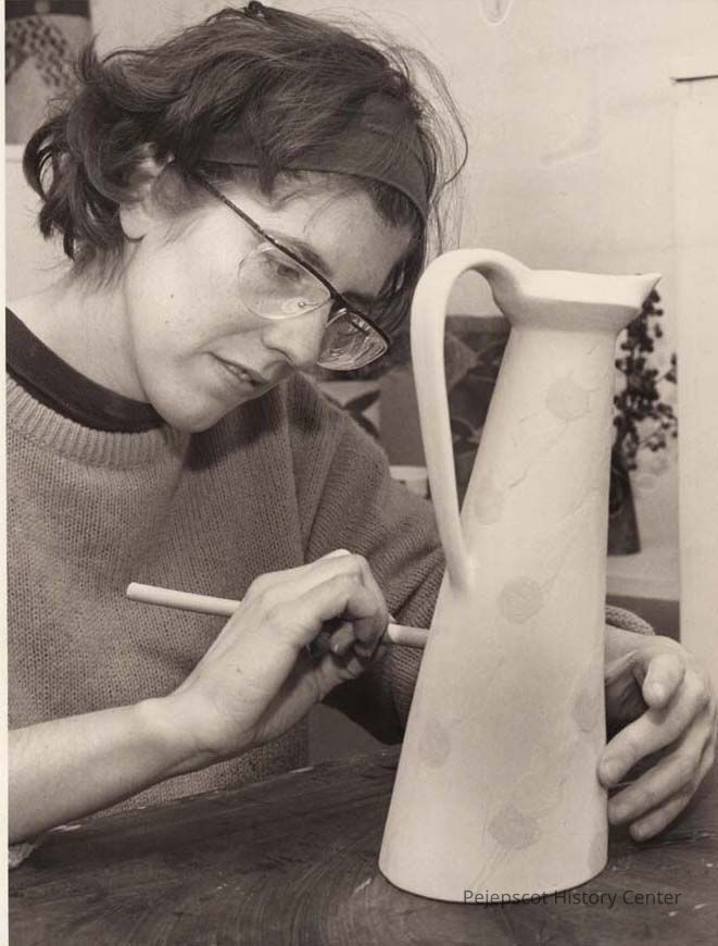 Wyler was working to finish the piece to add to the display at S. Wyler Pottery's first craft show. She and her partner, John Faulkner, had been selling wholesale and at craft shows for years, but decided to open their own shop in order to be less isolated, more visible to the public, and join the community of artisan shops in Brunswick, ME.