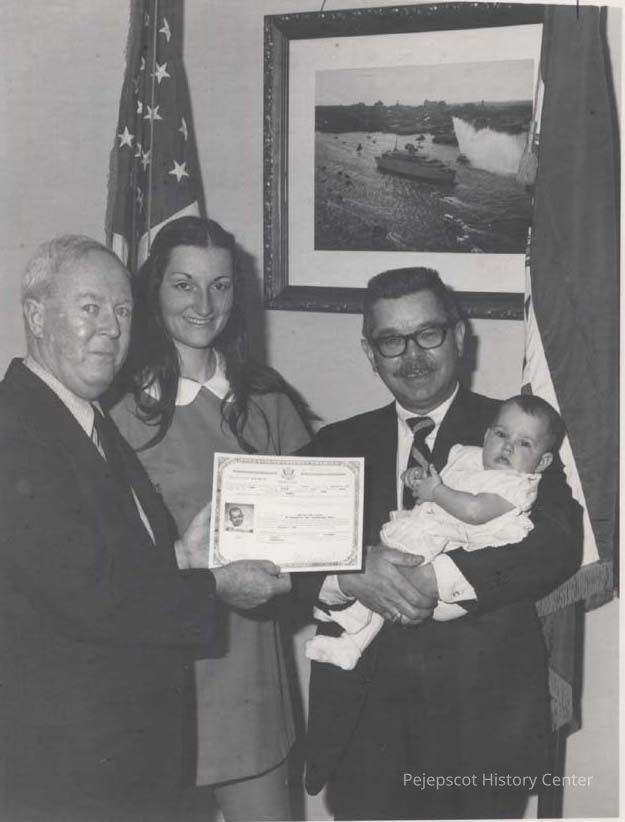 A black and white photo of Thomas W. Haney, naturalization examiner; [unknown] Carter of Brunswick; Arthur A. Poulin Jr, District Director of Immigration and Naturalization Service of Maine, and five-month-old Melissa Jean Carter, was published in The Times Record in Brunswick, Maine, on 4/12/1974.