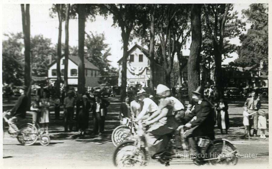 A B/W photograph of tandem bicycles at the Brunswick Bicentennial parade. Dated 1939.