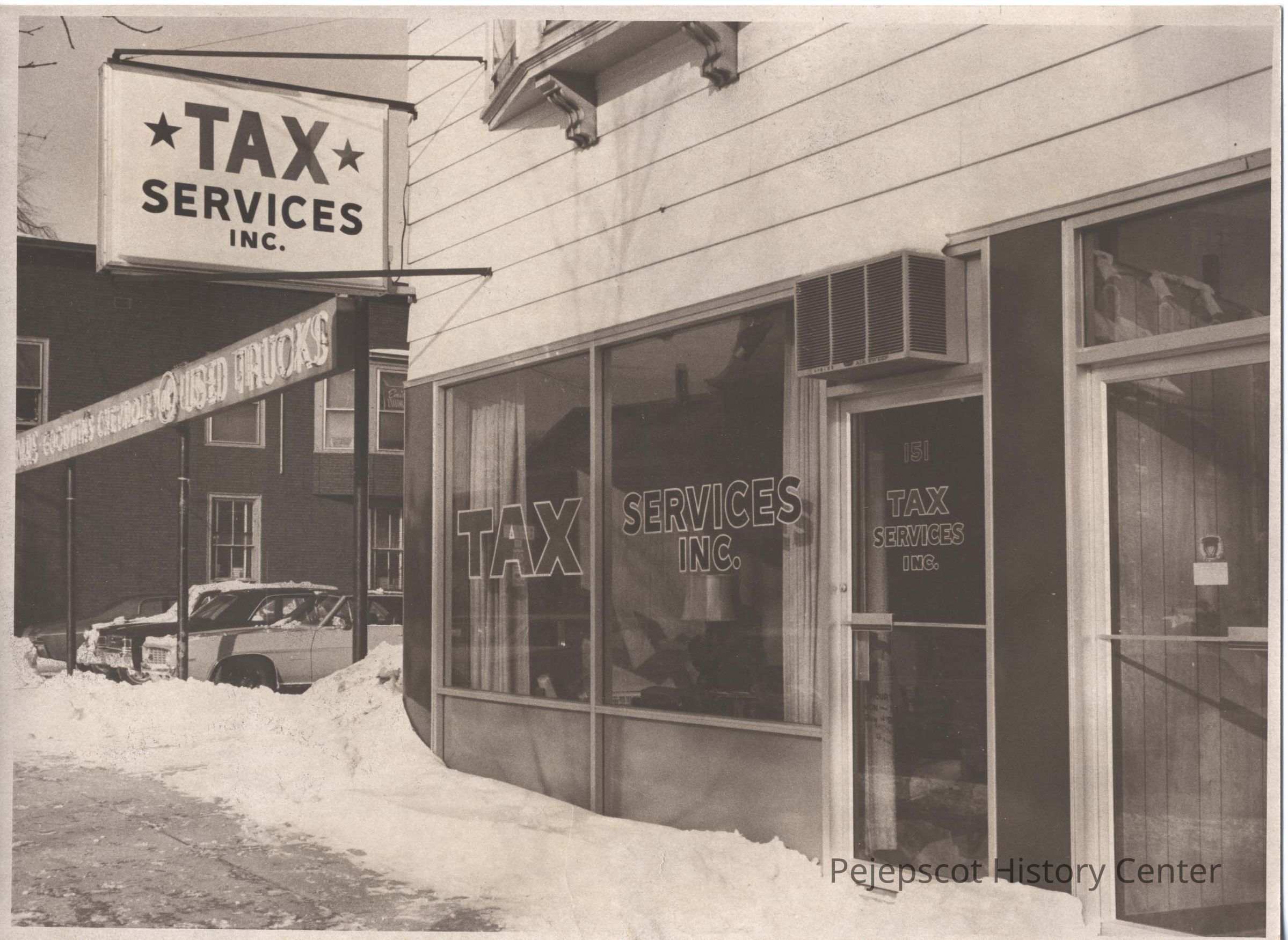 A B/W photograph of Tax Services Inc. store front. The photo was taken in the winter. Undated