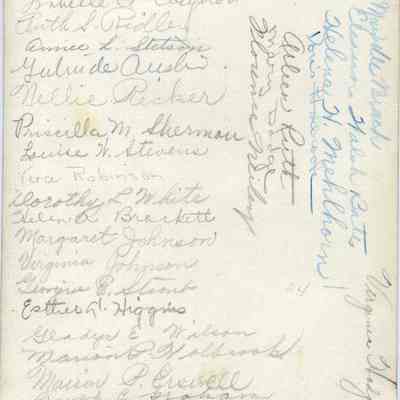 A B/W photograph of the Teachers Club 1920-1945. There are many names listed on the back. More names then there are people in the picture. None of the names are shown as being people in the picture. Undated