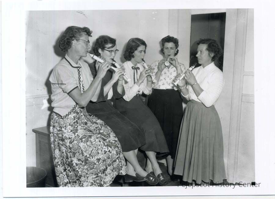 B/W photo of 5 teachers demonstrating toy flutes used to teach music in schools. Left to right: Mrs. Doris Warren, grade 3, Longfellow School; Miss Lillian Clark, grade 5, New School; Miss Yvonne Melbard, grade 4, New School; Mrs. Mary Libby, grade 3, Hawthorne School; and Miss Mary Dodge, grade 4, Hawthorne School.Lexicon