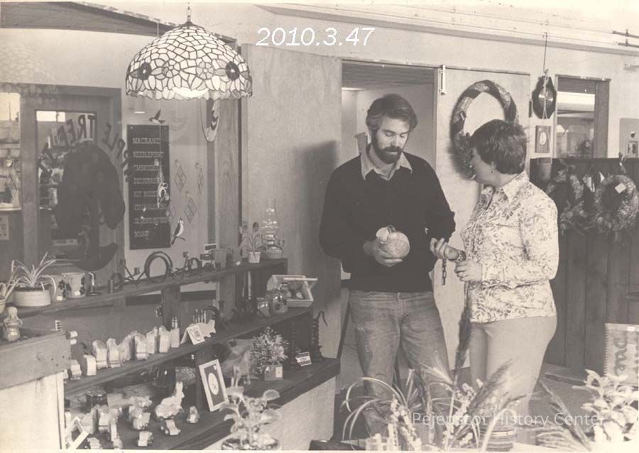 A B/W photograph of Ted Lindsey and Priscilla Montgomery in their new Tontine Mall gift shop, Apple Tree II. This photo was published by the Times Record on 10/4/1978, page 10. Undated