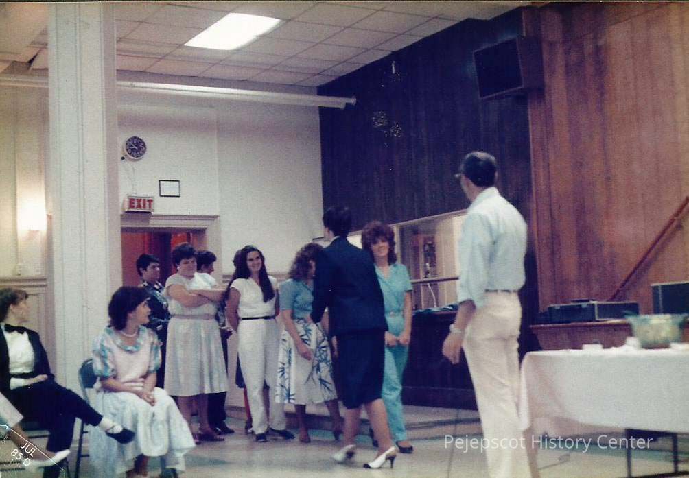 A color photograph of Teen Queen 1971 Doris Bernier Ouellet walking back after introducing herself. Shown are Mona, Donna Burns, Althea Walker , Irene , Kristina and Shirley